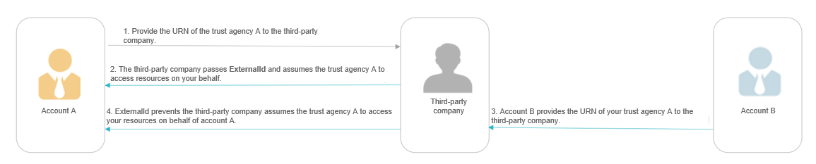 4. But this time, when account B requests the third-party company to access the so called "its" resources, the third-party company calls the AssumeAgency API and passes the ExternalId (456789) associated with account B. Since you only added your ExternalId (123456) but not the ExternalId (456789) of account B to the trust policy, the AssumeAgency API fails to use the URN of trust agency A.