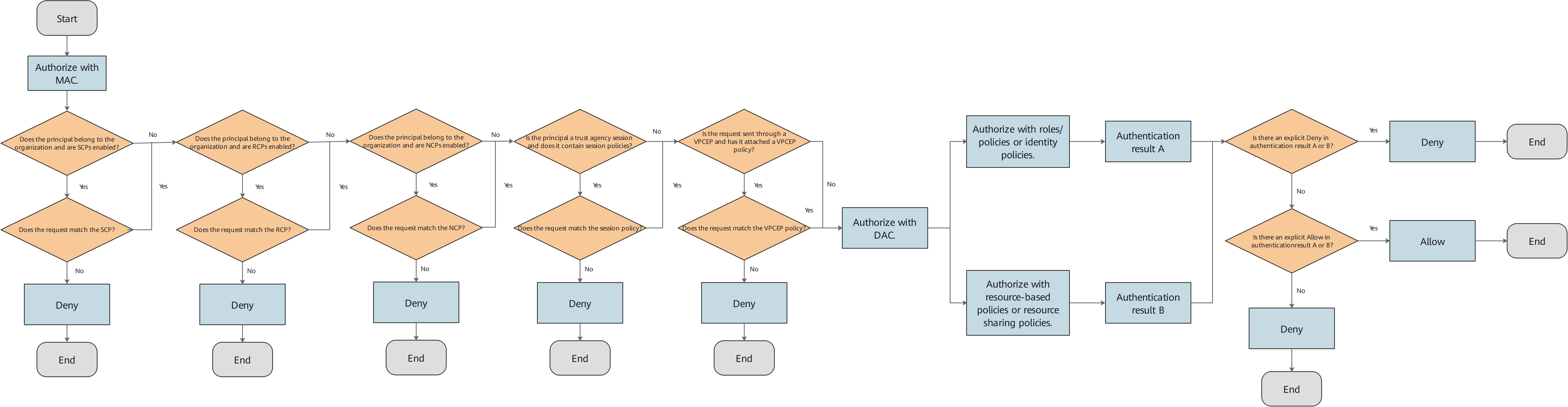 IAM policy evaluation logic is classified into intra-account authorization and cross-account authorization. IAM checks the mandatory access control (MAC) policy and discretionary access control (DAC) policy based on the authentication request context. If the authentication request context does not match any "Allow" MAC policy, the authentication result is "Deny". After checking the MAC policy, IAM checks whether the principal of the request is authorized by the DAC policy. For details about MAC policies and DAC policies, see Access Control Policies Supported by IAM.