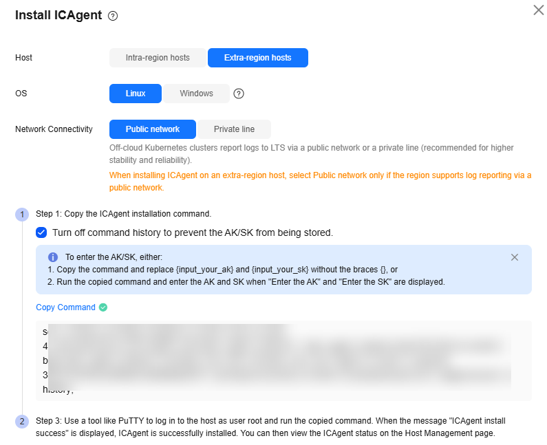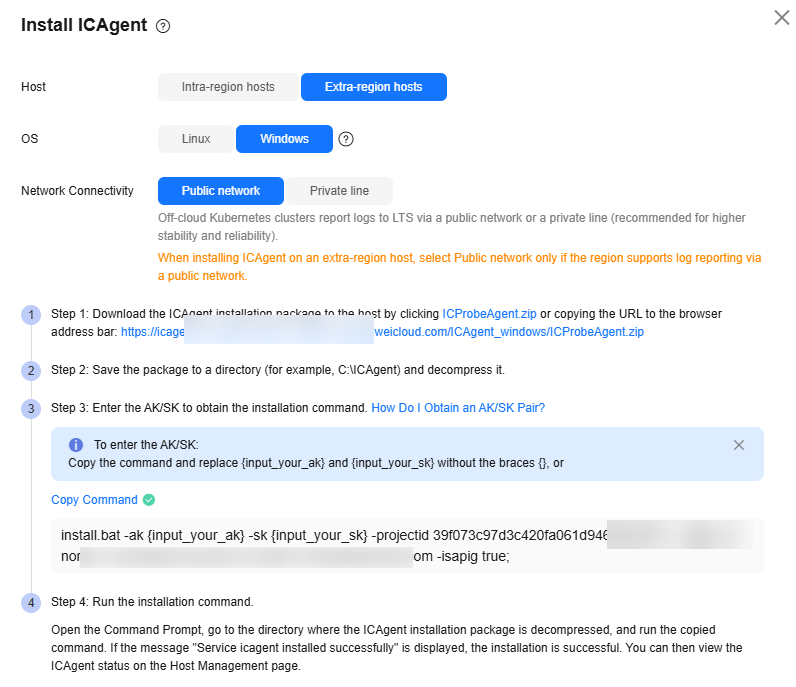 - Obtain an AK/SK. For details, see How Do I Obtain an Access Key (AK/SK)? On the Install ICAgent page, copy the ICAgent installation command and replace the AK/SK in the command with the obtained one.