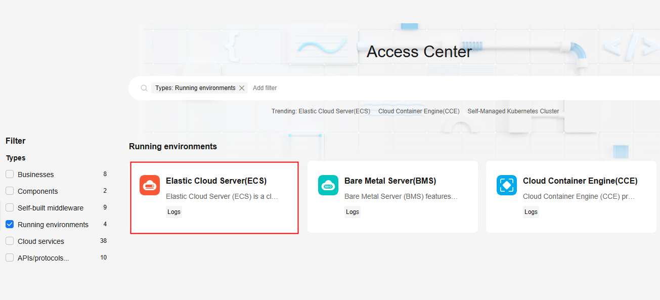 - In the navigation pane, choose Log Ingestion > Ingestion Center. On the displayed page, select Running environments or Cloud services under Types. Hover the cursor over the Elastic Cloud Server(ECS) card and click Ingest Log (LTS) to access the configuration page.