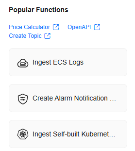 This area provides quick access to common functions. The Price Calculator, OpenAPI, and Create Topic options stay fixed at the top, while three common functions are displayed in the lower part. Click them to access the page for using the corresponding function.