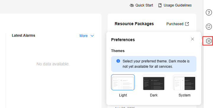 on the right. - On the Preferences page, select one of the following themes for your LTS console: Light, Dark, or System.