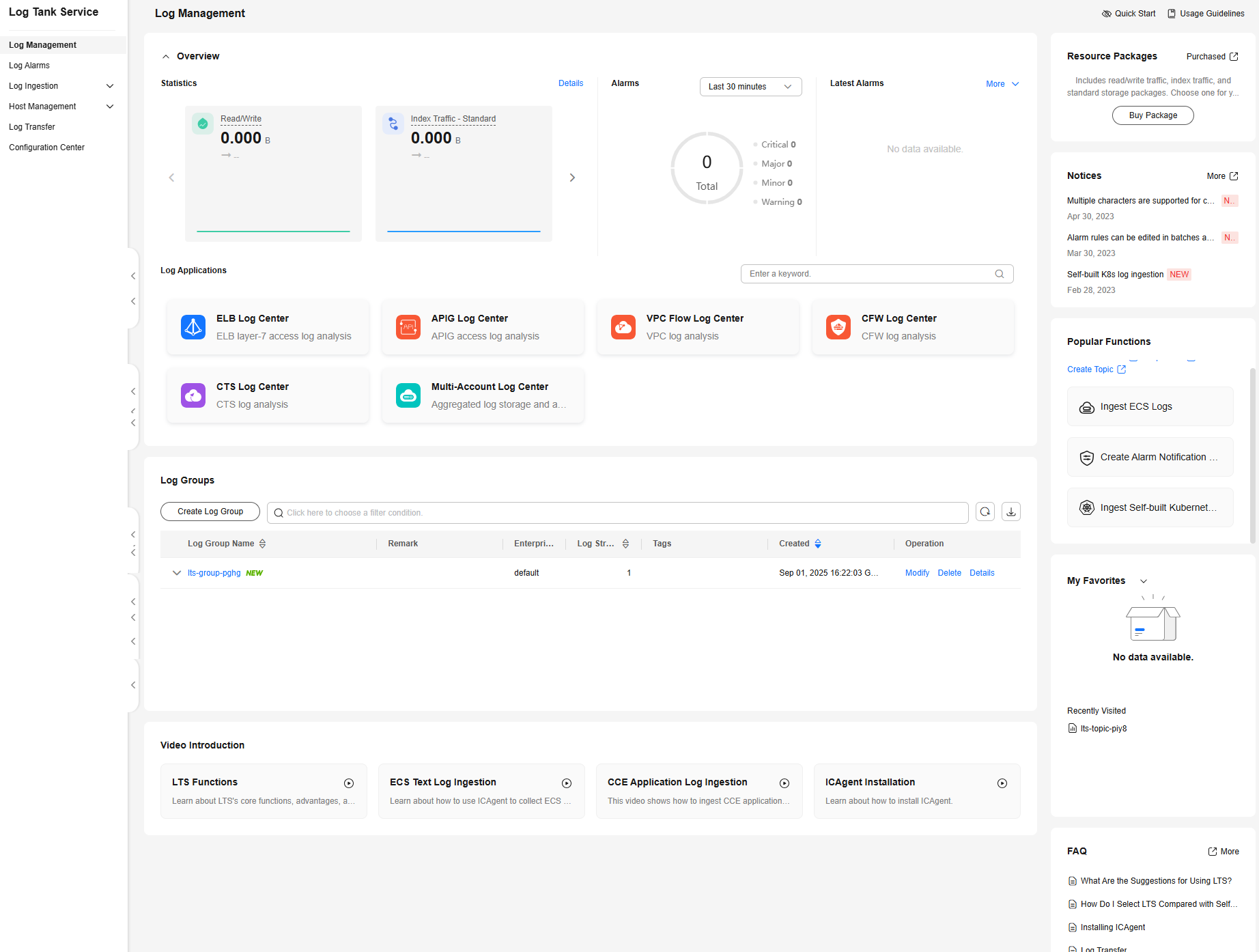 This area shows video tutorials for common tasks like using LTS features and ingesting ECS text logs to LTS, helping you quickly know how to use LTS. |