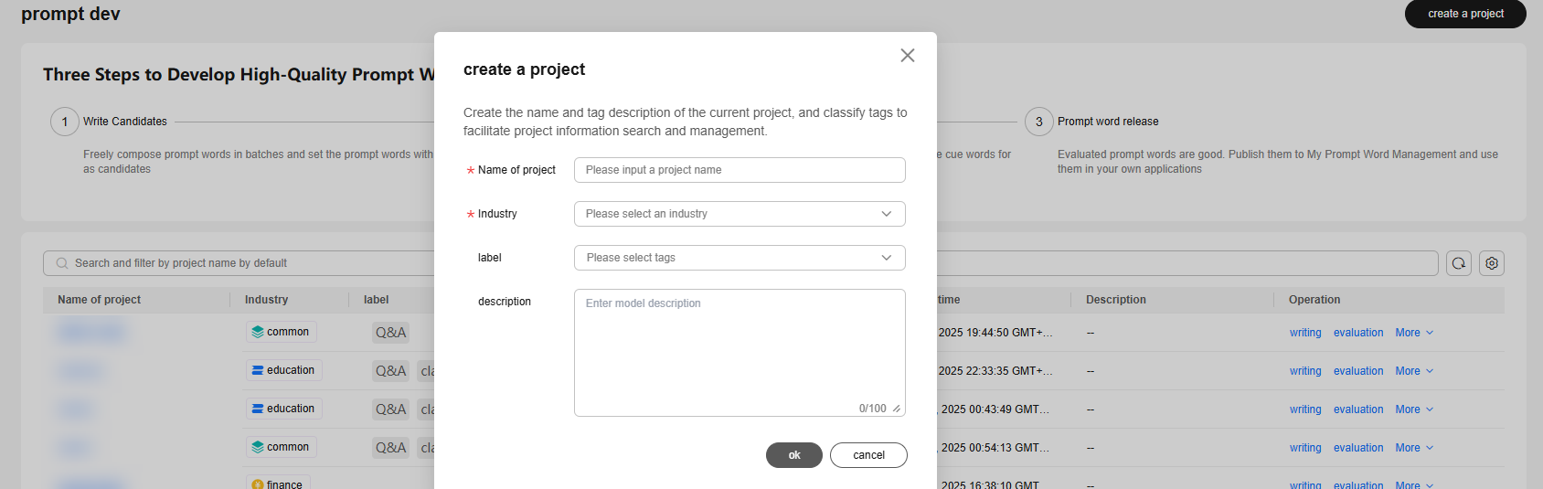 3. Enter the project name and description, and select the industry and label. Click ok.