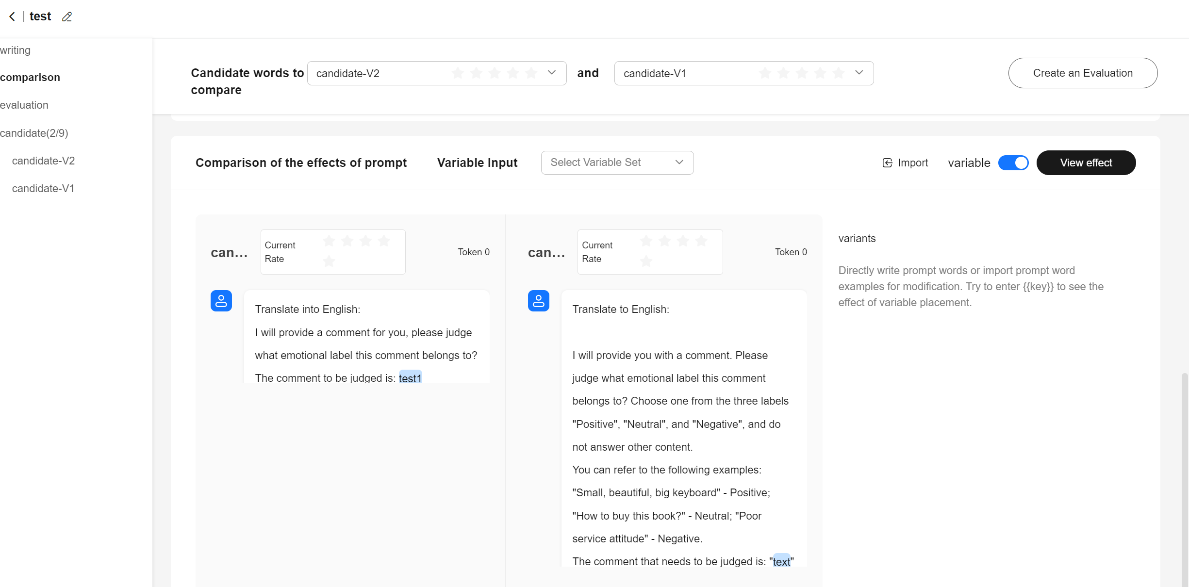5. In the horizontal comparison page, scroll down to the Comparison of the effects of prompt area. Enter the same variable values, and compare the outcomes of the two prompts.