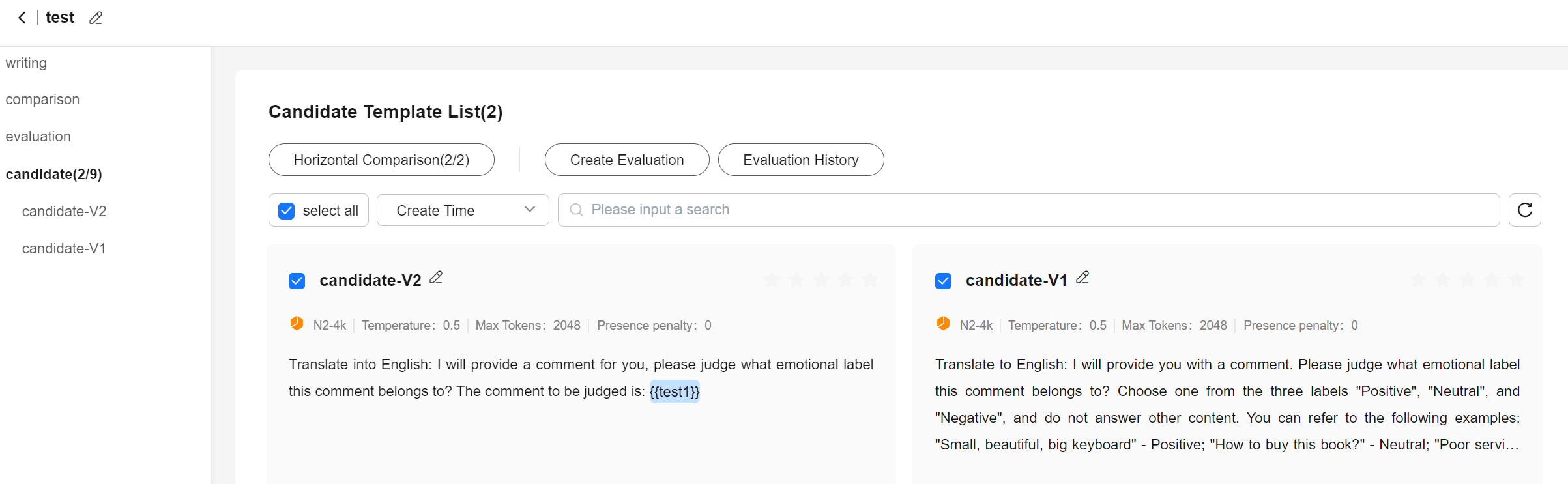 Perform horizontal comparison of prompt outcomes between different candidate prompts to see their differences.