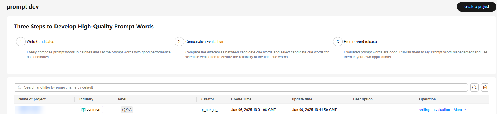 3. In the prompt engineering project list, locate the desired project and click writing in the Operation column.