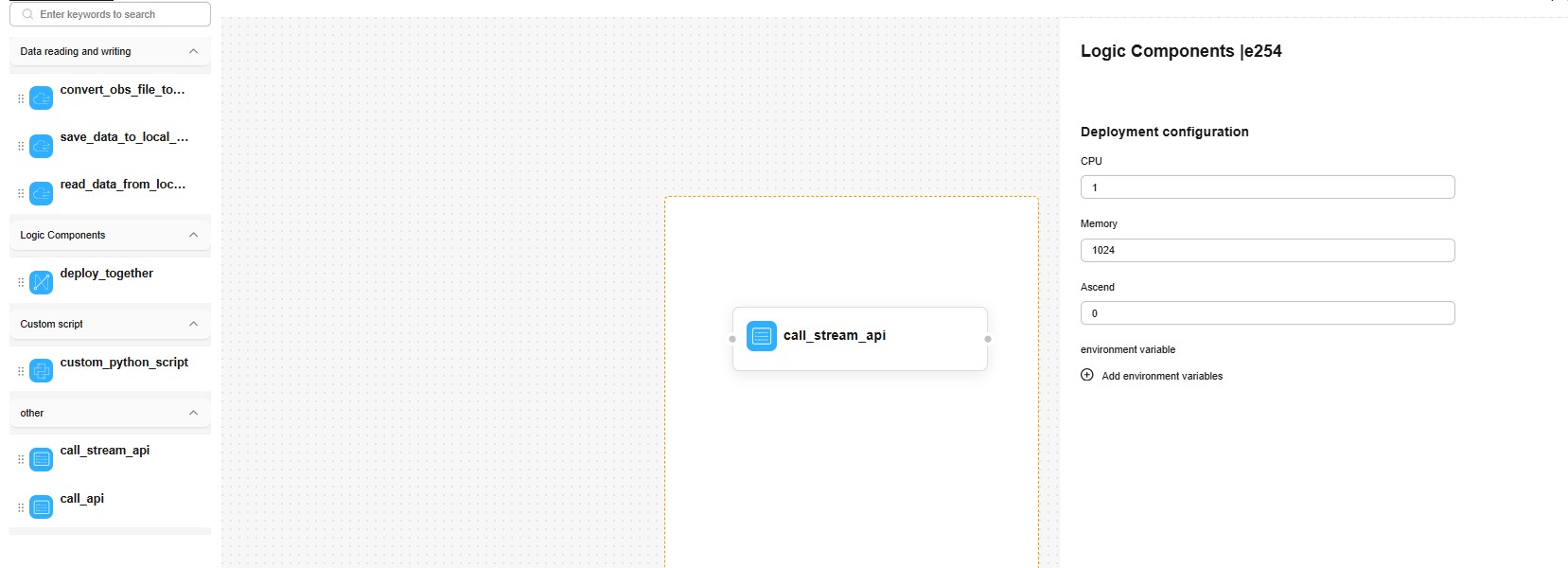The call_stream_api component can be used to invoke the model service with deployed streaming output parameters. For example, the component parameters in the NLP model streaming scenario are described as follows:
