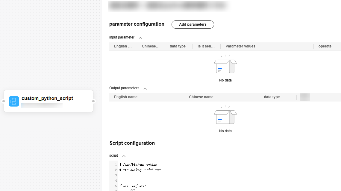 The functions of the custom_python_script component are similar to those of the custom script component in component management. You can compile Python code to implement specific component functions. The difference is that the custom_python_script component allows you to create and delete parameters in the canvas and compile script code. If any problem occurs during debugging, you do not need to return to the component management page for processing, which greatly facilitates debugging, after the debugging is complete, the component can be archived on the component management page. Note that each time you drag the custom_python_script component to the canvas, you need to create its parameters and supplement the script. When you delete the component, the created information will be lost.