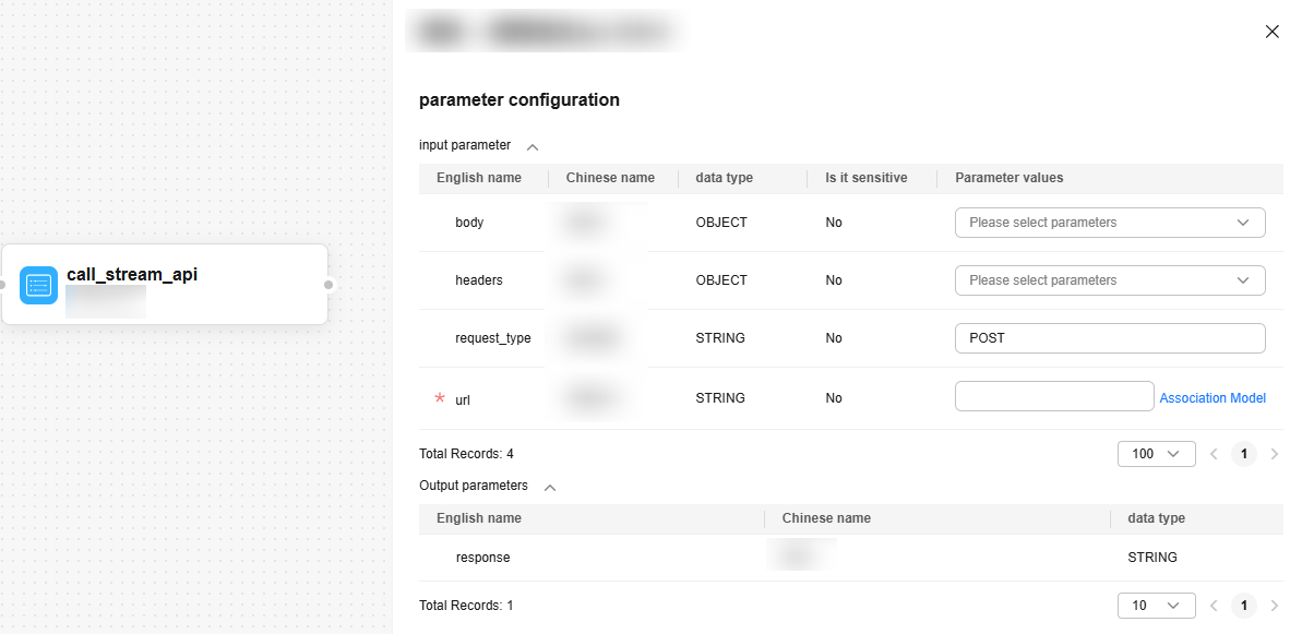 The call_api component can be used to invoke the five deployed model services (non-streaming output parameter scenario). The component parameters are described as follows.