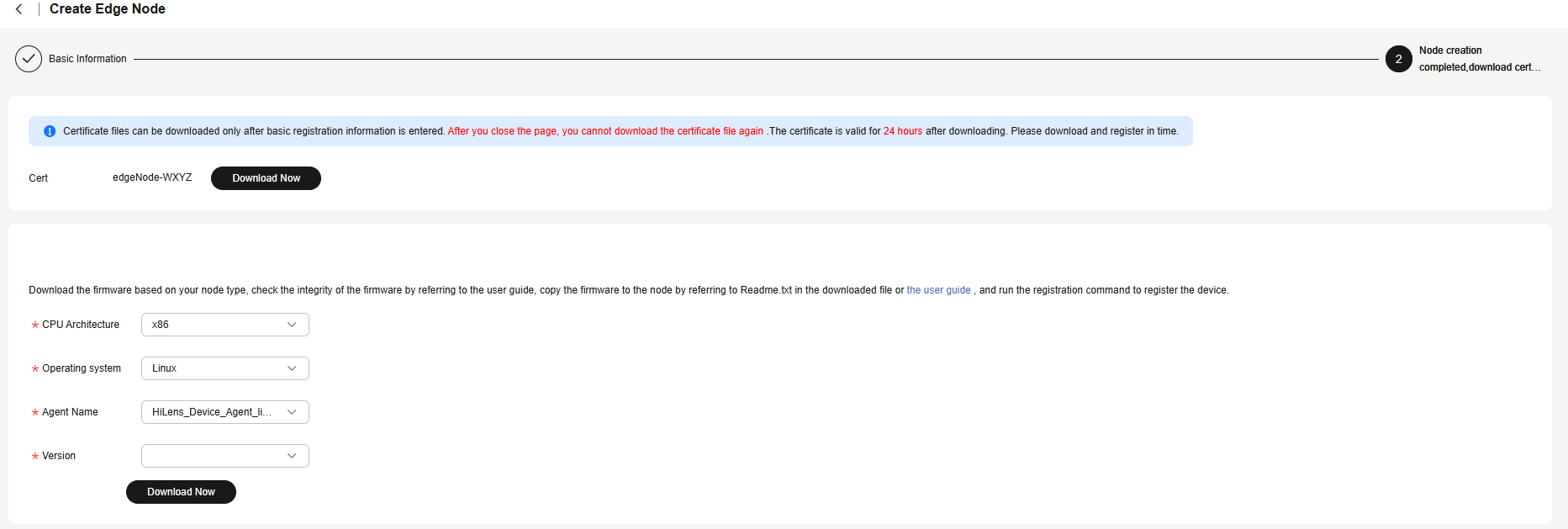 - After the basic information is configured, click OK. Click Download Now to download the device certificate and Agent firmware, and rename the device certificate and Agent firmware as license.tgz and hilens-agent.tgz, respectively.