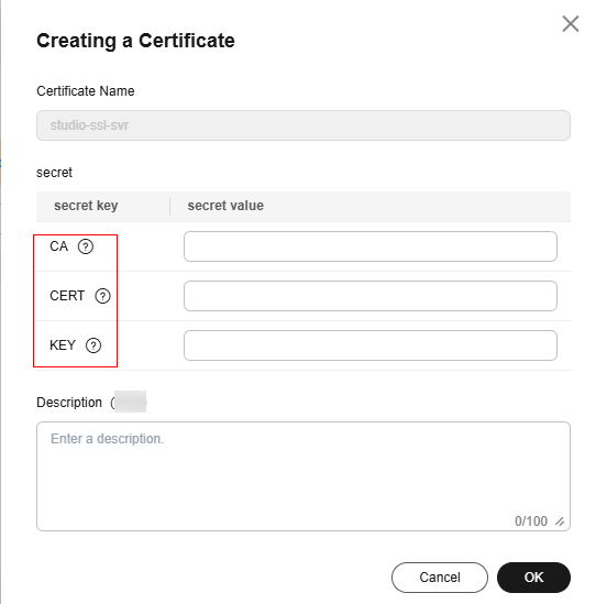- You can run the view command to view the certificate key value, for example, view server.crt. The key value entered on ModelArts Studio must be encrypted using Base64 (echo -n "Copied key value" | base64).