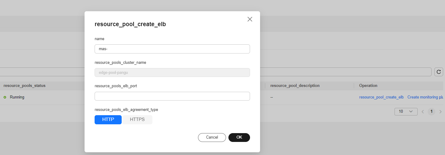 - Enter the load balancer name (in the format of mas-xxx), set the listening port (ranging from 30000 to 40000), and set the protocol type (using HTTP or HTTPS requests for calling the inference model). Click OK.