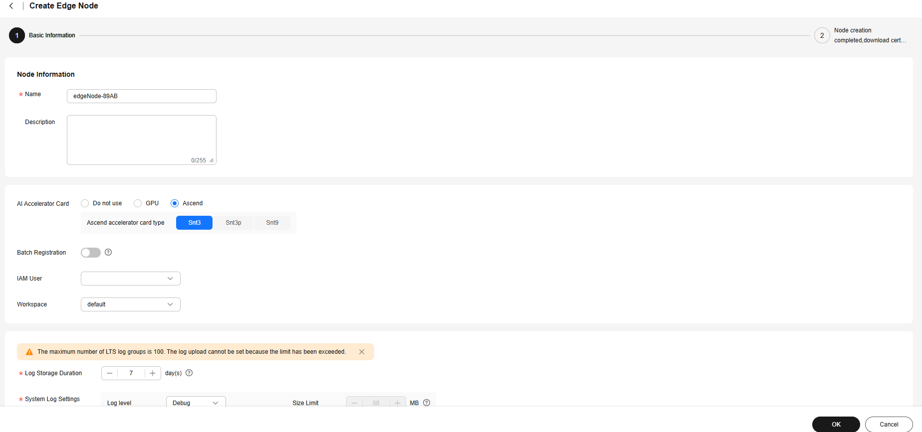 - On the Create Edge Node page, enter the node name and configure the AI accelerator card and log information.