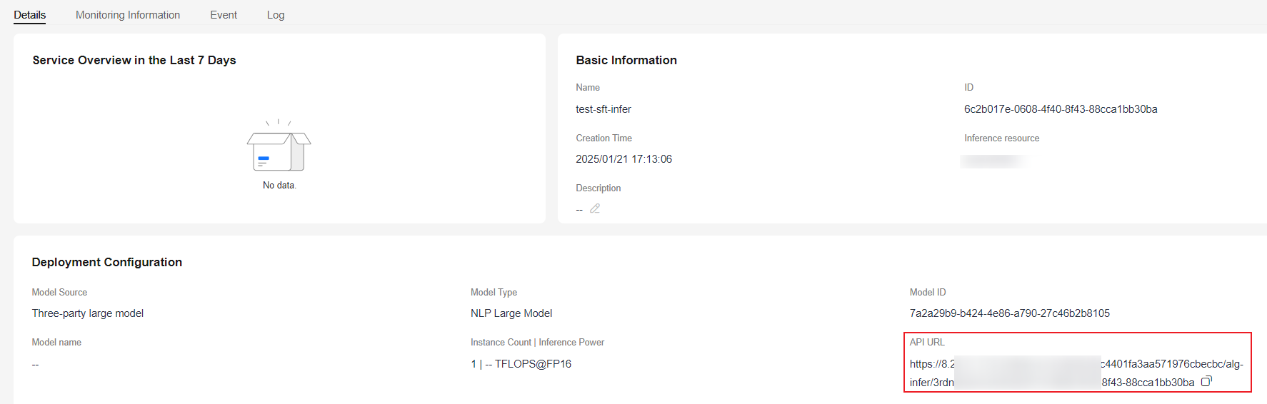 - In the navigation pane on the left, choose Model Development > Model Deployment. Click a model name and obtain the API domain name on the details page.