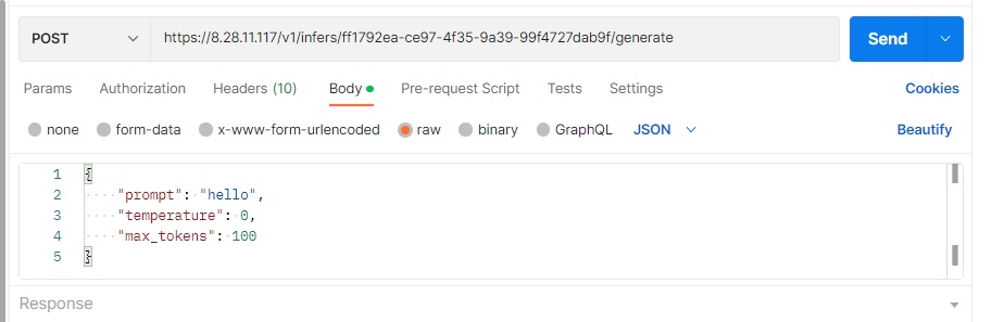 { "prompt": " Hello," "temperature": 0, "max_tokens": 100}Figure 3 Entering the request body of the third-party model