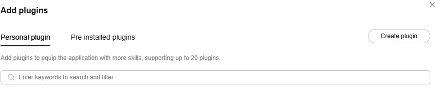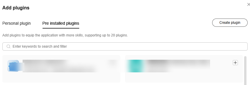 Plug-in skills can be added to agents. Preset plug-ins and personal plug-ins can be added.