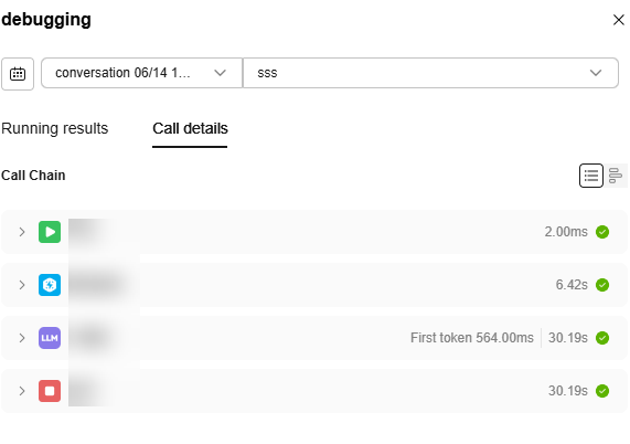 2. During the trial run, you can click debugging in the upper right corner to view the debugging result, including the running results and call details.