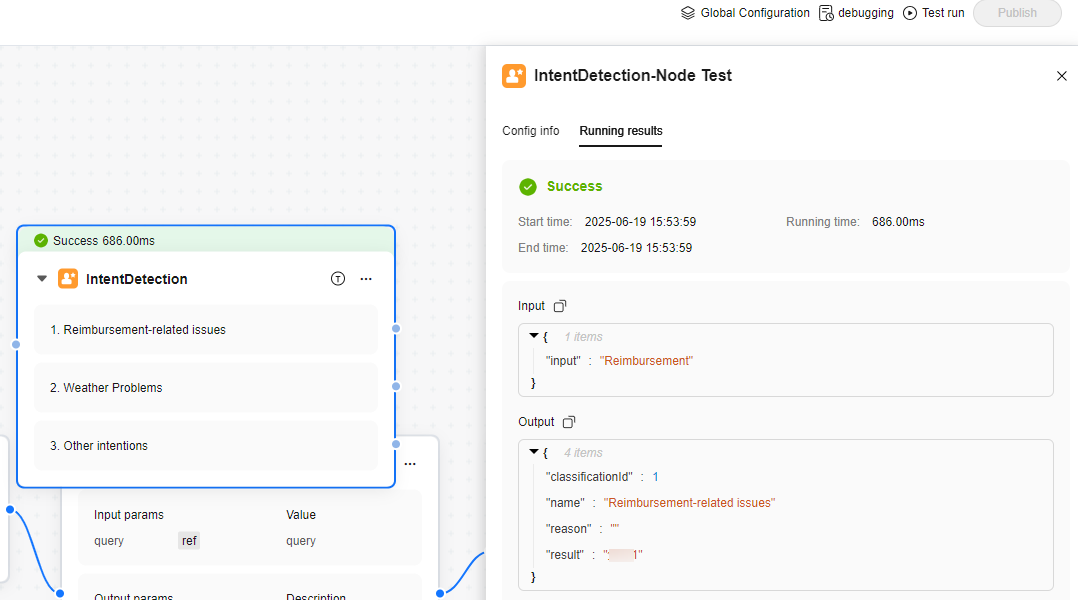 • Debug a single node. The following uses the Intent Recognition node as an example: