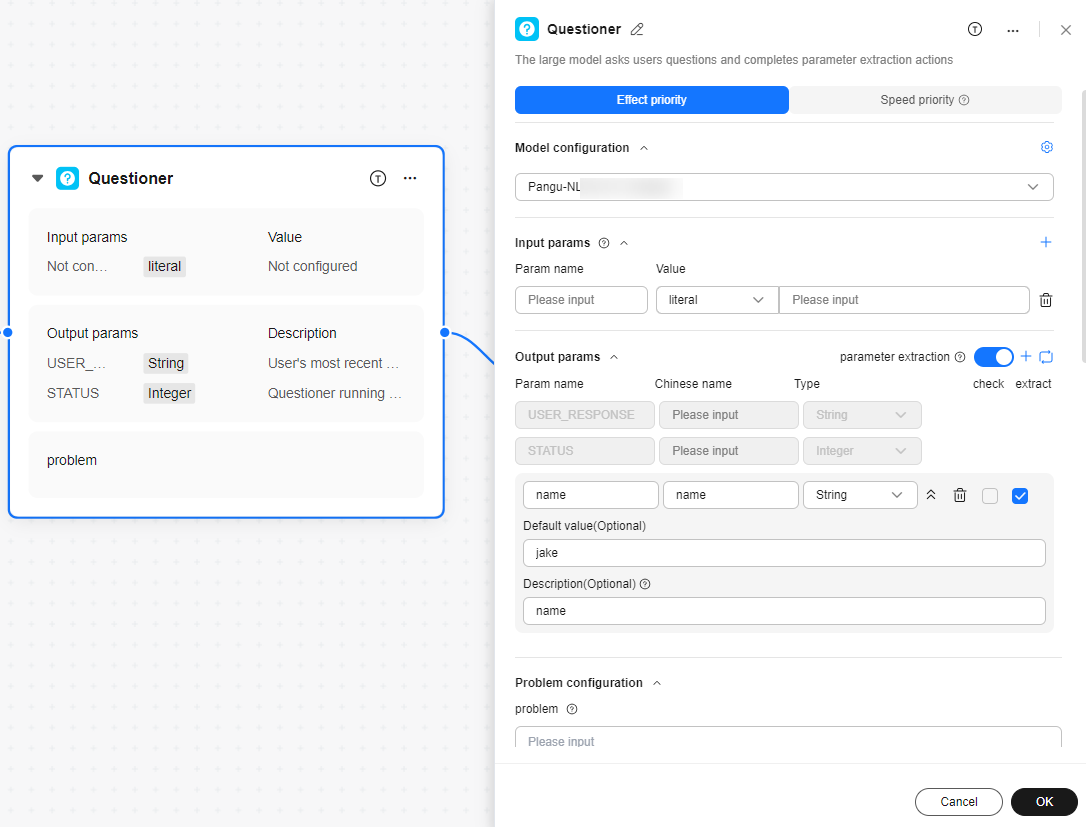 The Questioner model is used to receive the natural language of the user and extract the output parameters configured by the user. When Effect priority is selected, the Questioner node is also used to extract the result for reflection and correction.