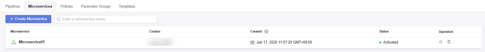 Time when the microservice was created. You can move the cursor to the Created column and click