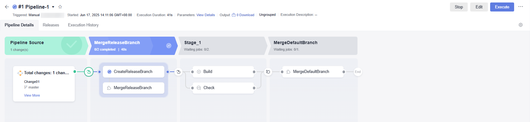 - MergeReleaseBranch: The change-triggered pipeline automatically pulls a new branch from the master branch and integrates all change feature branches into the new branch.