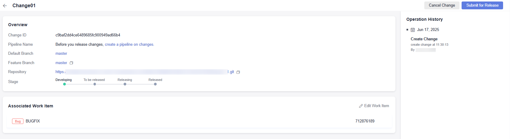 The details page displays the change overview, associated work items, and operation history. You can submit the change for release, exit release, or cancel the change.