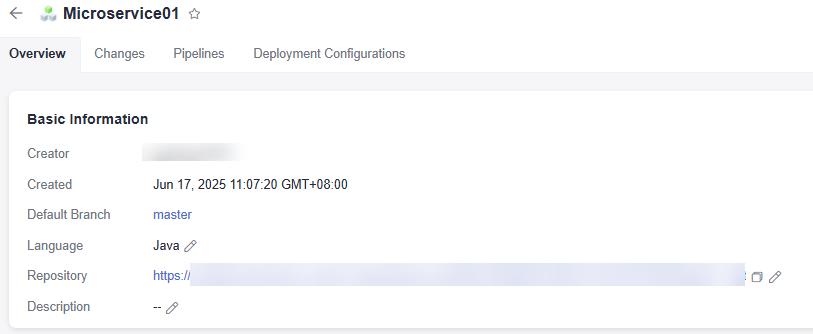Information such as the creator, creation time, and code source is displayed. You can edit the language, repository, and description.