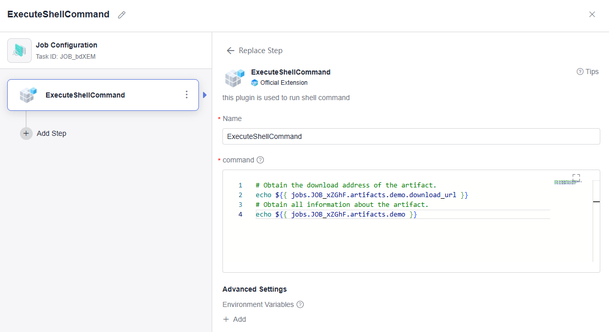 Figure 3 Adding the ExecuteShellCommand extension - Execute the pipeline. After the execution is successful, check the printed artifact information in the log.