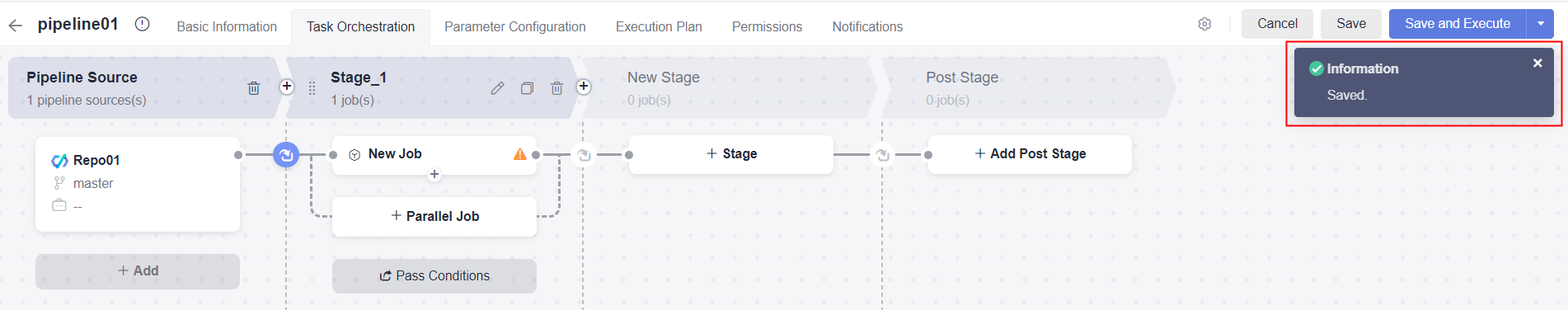 5. After the configuration, click Save. A message is displayed, indicating that the pipeline is saved successfully.