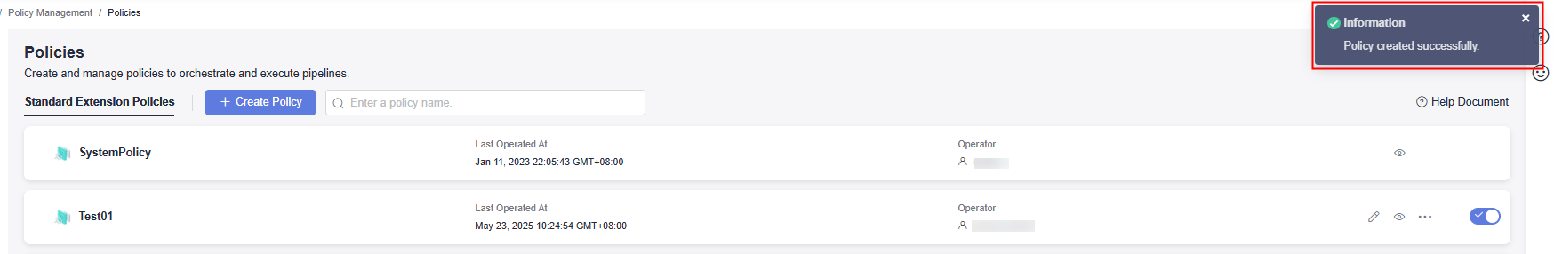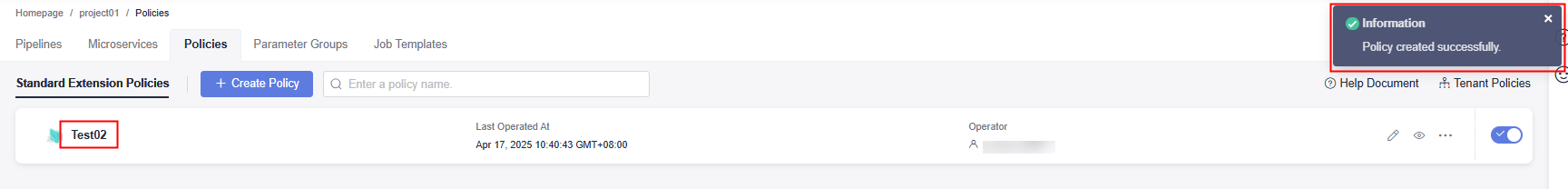 • A policy is a set of rules defined as different condition templates for a step extension. Each policy can be applied to multiple pipelines. There are tenant-level policies and project-level policies. You can use them to control pipeline runs for high-quality delivery.