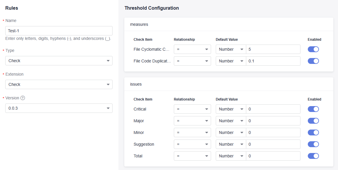 • A rule defines different comparison operators based on extension thresholds to determine whether to apply the extension output to stage pass conditions. Multiple such rules constitute a policy. For details, see Configuring a Rule.