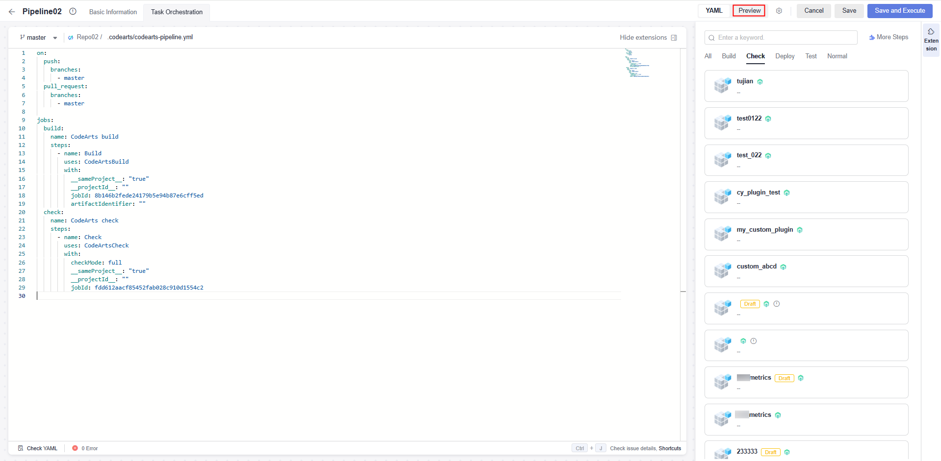 - You can edit the YAML file on the left. For details, see YAML Syntax. The following uses serial tasks of build and code check as an example.