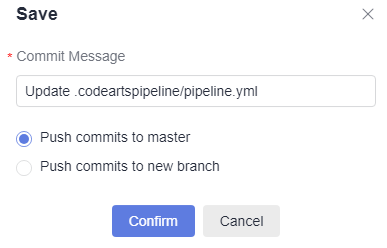 - Push commits to the existing branch: If you create the pipeline with a new YAML file, commits will be pushed to the default branch. If you create a pipeline with an existing YAML file, commits will be pushed to the branch where the YAML file resides.