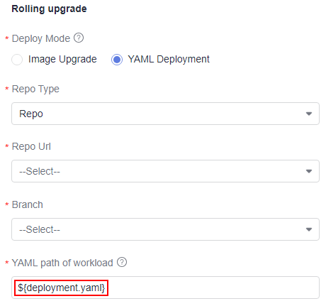 - When configuring a release policy, you can use ${variable name} to reference an environment variable in the YAML path, for example, the workload YAML path in the rolling upgrade task.