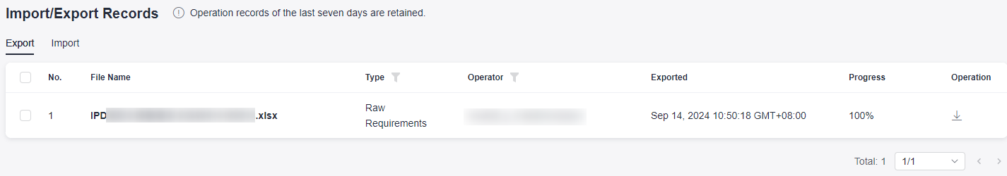 - Download the desired work items. All project members' export records of any types of work items will be displayed on this page.