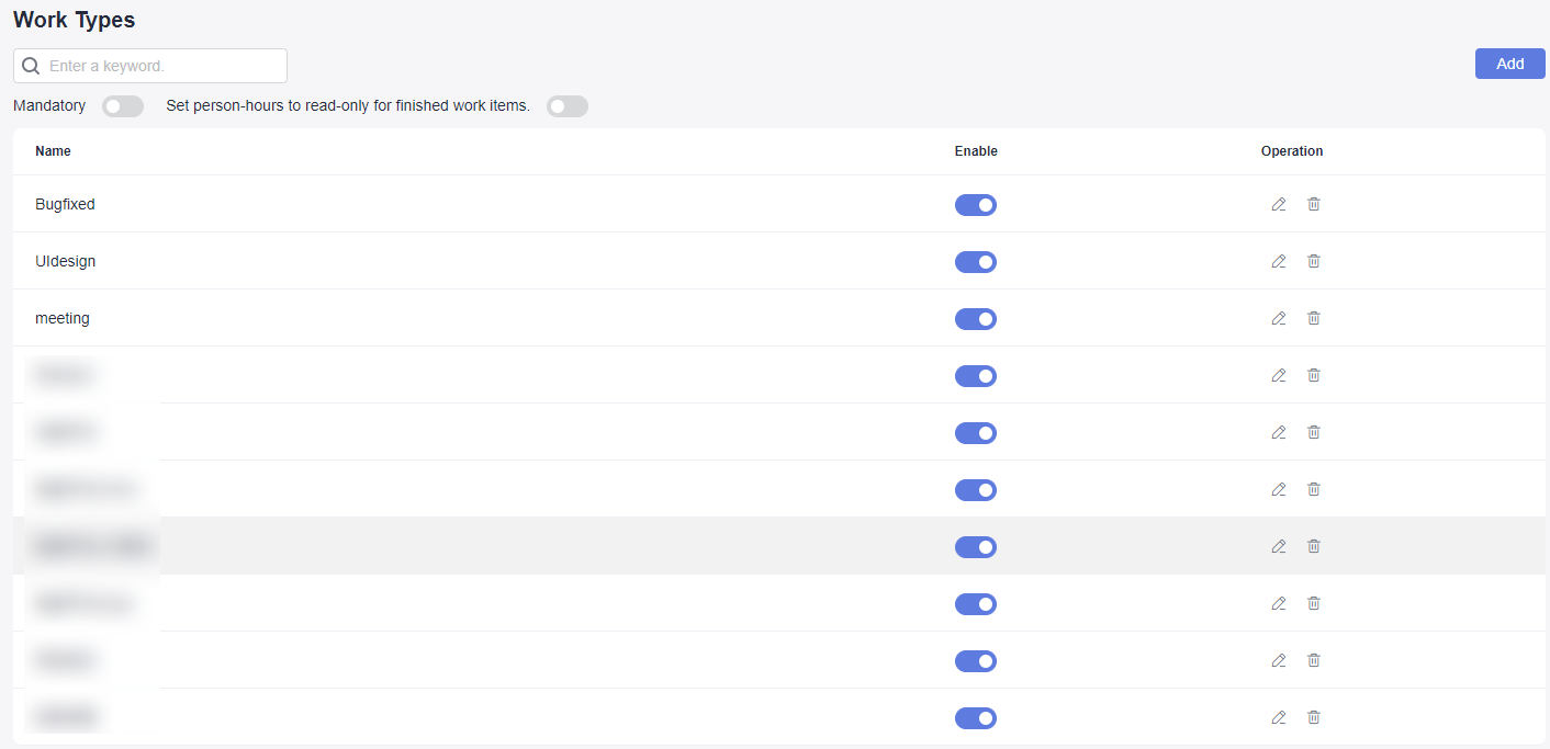 The default work types are as follows: R&D design, backend development, frontend development (web), frontend development (applet), frontend development (app), test and verification, defect rectification, UI design, meeting, public affairs, training, study, reassignment and leave, and other. You can add more work types as required.