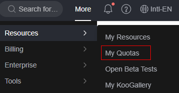 - In the upper right corner of the page, choose Resources > My Quotas.