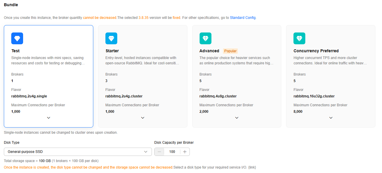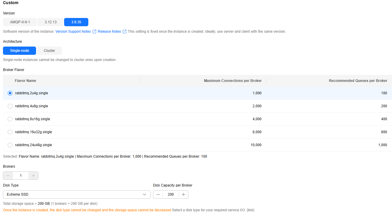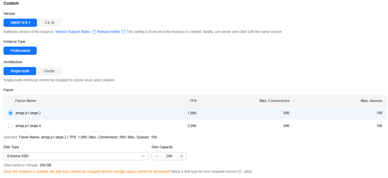 DMS for RabbitMQ provides preconfigured specifications. You can select one as required. Specify the disk type and capacity as required. The disk type is fixed once the instance is created.