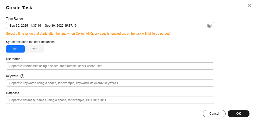 Figure 1 Log settings - Click Create Task. In the displayed dialog box, specify Time Range, whether to synchronize to other instances, and other configuration items, and click OK.