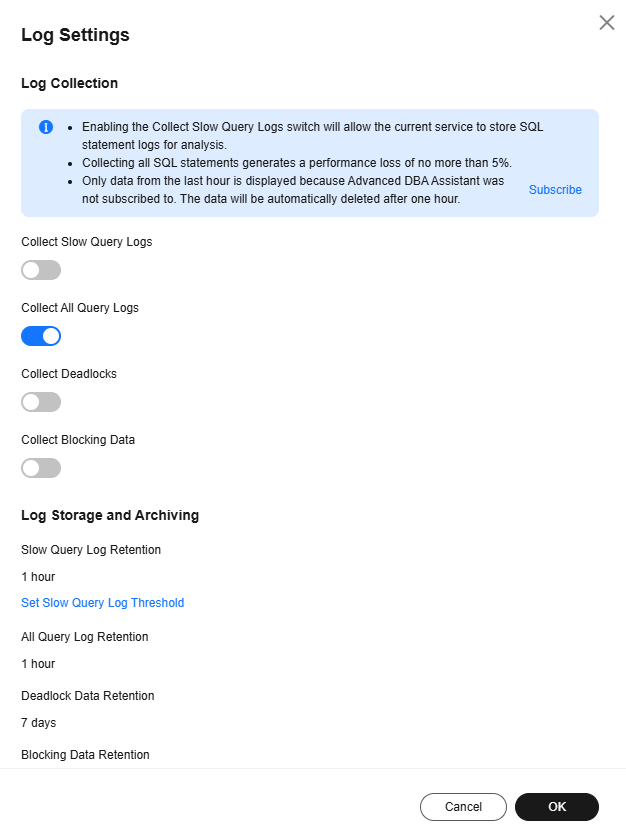 To disable this function, click Log Settings in the upper right corner, toggle off the Collect All Query Logs switch, and click OK.