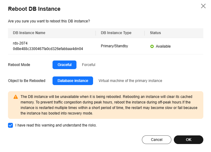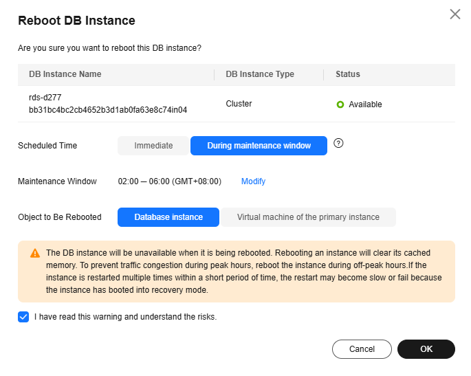 - Rebooting DB instances will cause instance unavailability and clear cached memory. To prevent traffic congestion during peak hours, you are advised to reboot DB instances during off-peak hours.