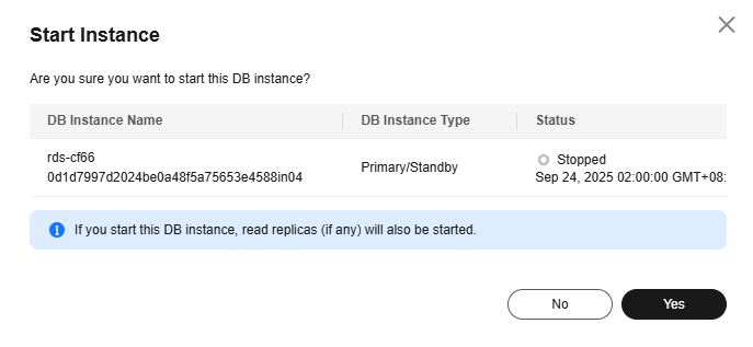 After a DB instance is started, the VM where the DB instance is located is billed again.