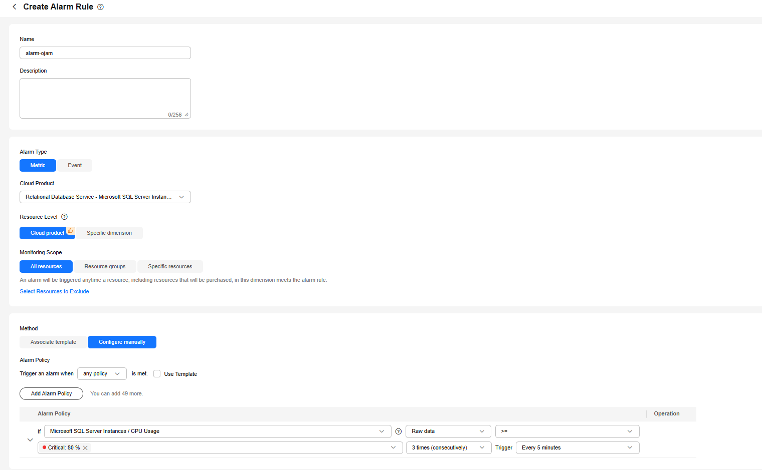 If you select Configure manually for Method, you need to configure alarm policies.