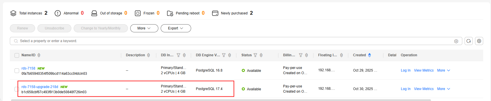 - After a major version upgrade is complete, a new DB instance is created. The original DB instance is still retained and billed. You can release the original instance when the workloads on the new instance run stably.
