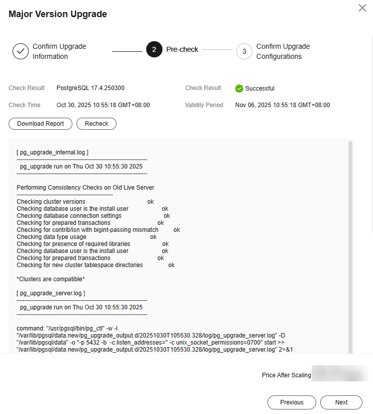 - If any extensions are installed on the instance after a successful upgrade check, an upgrade may fail due to compatibility issues. If this happens, perform a check again. For details, see Extensions Unsupported for Major Version Upgrades.