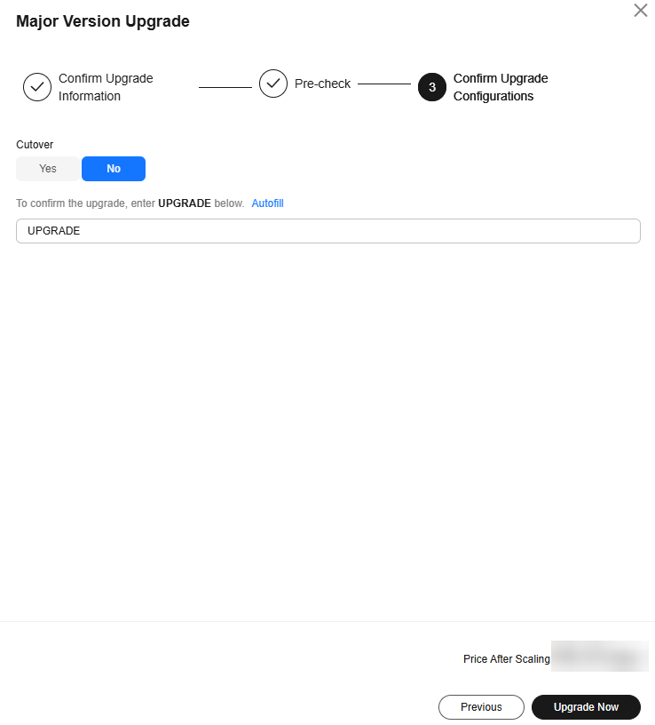 - After the check is passed, select No for Cutover, click Autofill to fill UPGRADE, and click Upgrade Now.