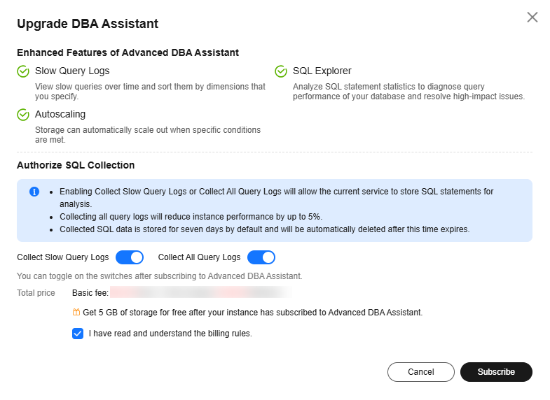 - Click Upgrade DBA Assistant. In the displayed dialog box, you can learn about the enhanced features and billing rules.