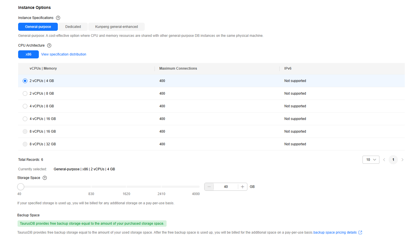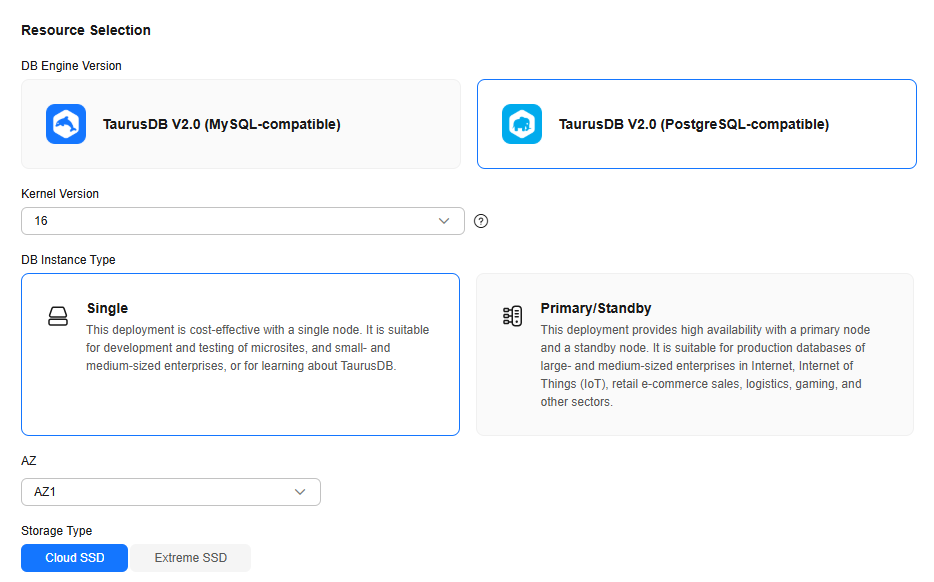 - Single: uses a single-node architecture, which is less expensive than primary/standby DB instances. It is suitable for development and testing of microsites, and small- and medium-sized enterprises, or for learning about TaurusDB for PostgreSQL.