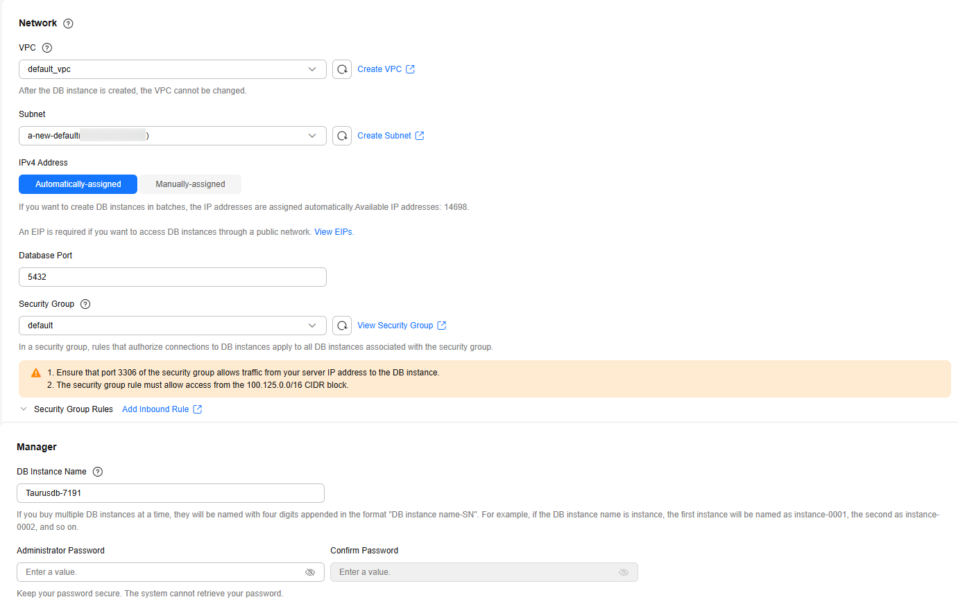 - The default database port is 5432. You can change it after the DB instance is created. For details, see Changing a Database Port.